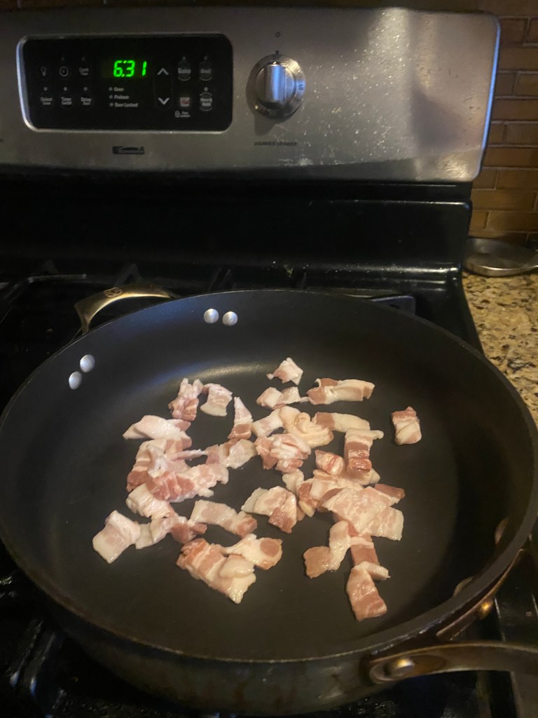 Step 1: Render out the bacon fat until bacon is to your preferred texture. You won’t need that much bacon fat, so take out about 2/3 (save for another day). Remove bacon after cooked.
