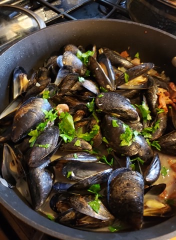 Grape Tomatoes – These will become flavor bombs when cooked with the mussels. 1/2 a box or however much you want can go in.