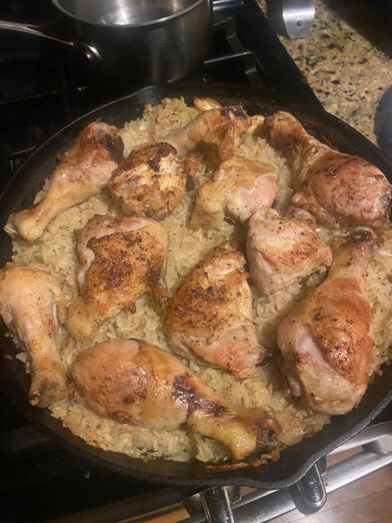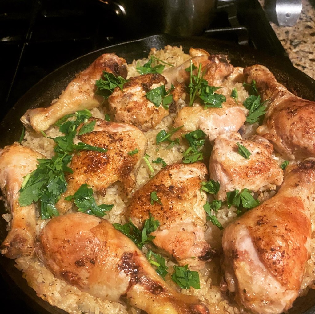 There was at one point where I would eat a package of 8 chicken thighs within two weeks. Chicken became my go-to protein for weeks on end because they were so versatile and kinda hard to screw up. Plus, I was going through a stock/broth making phase and wanted an excuse to have bones. This recipe became a personal favorite as it allowed me to make one or two complete meals in with very little preparation and forethought. Most of the ingredients I already have in my pantry so all it really required was chicken and other spices. The only other thing that’s special about this dish, is cooking it with equipment that can withstand oven heat. I have a wonderful cast iron skillet that I use, but you can also use a Dutch Oven or even certain non-stick pans. This is one of those one-pot meals that you spend maybe 10-15 minutes preparing for in the beginning, before sticking it into the oven for about 45-60 minutes and then dressing it at the end. I usually made one portion for dinner and then take the second portion to school for lunch, but that’s entirely up to you how you want to structure your meals. This may be the only meal that is somewhat equivalent to “meal-prepping”.