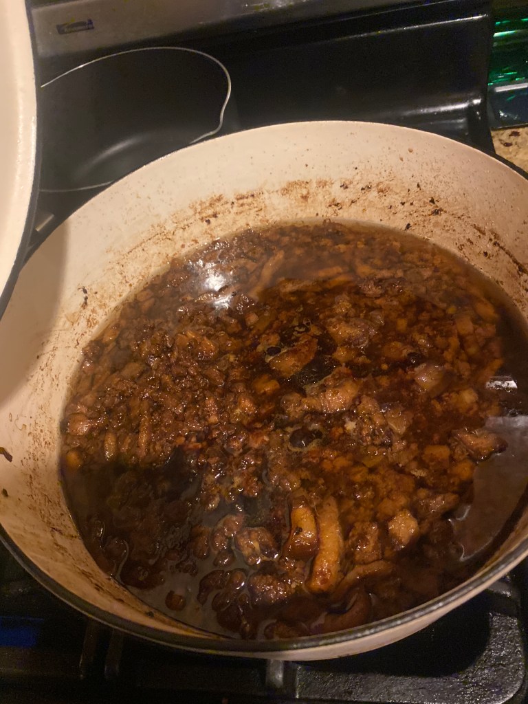 Pork – Ok, so pork belly is a given, but how much you may ask? Well, as I always I was using my massive dutch oven to cook this, so it’s hard to give a proper gauge. For a huge portion I used like 4lbs of pork belly and 1.5-2 lbs of ground pork, but I think for something small start with 2 lbs or less of pork belly and 1 lb of ground pork. I typically like ratios of 3:1 or something similar between pork belly and ground pork. There’s a luscious-ness to the dish when you have pork belly, but remember a good amount of pork belly is still lean.