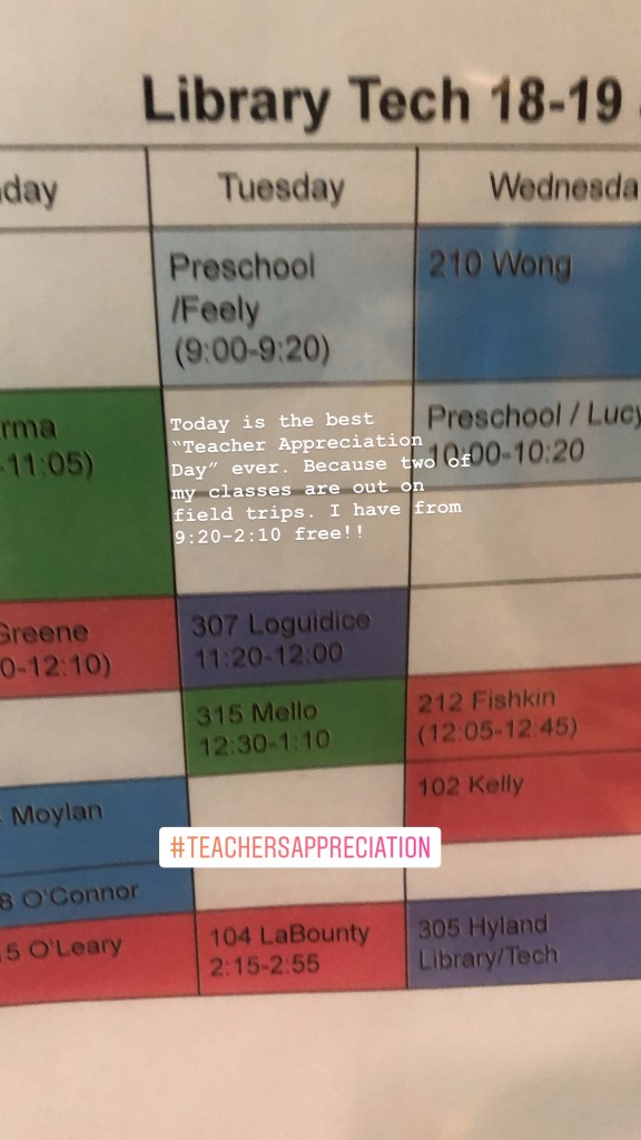 While never “promised” a history position, I kept hearing the old adage of “getting the foot in the door”, show your loyalty and devotion, and one day it will be rewarded. All of my colleagues from my cohort moved away from their student teaching districts, but I was stubborn, and naive, that maybe one day I would teach history. So my career of subbing began, I took on an ETS (extended term substitute) role for the high school librarian who was out on maternity leave, and there I honed my relationships with my high school colleagues and learned more about research and supporting students. Because I did “such a great job”, I was offered a second ETS, this time as an elementary school librarian (you can read the Day 1 and Day 60 posts I wrote). Working at the Baldwin School that first time was so much fun. I learned so much in community with the teachers there. Out of all the schools I’ve worked at in Cambridge, being at the Baldwin felt the closest to family. Everyone cared about each other, people were supportive, not because they had to, or there was some morale group, but rather because they wanted to care for each other. It was sad to leave when my contract ended, but luckily I applied and was accepted for another ETS, this time a whole semester as the US History II teacher back at the high school.